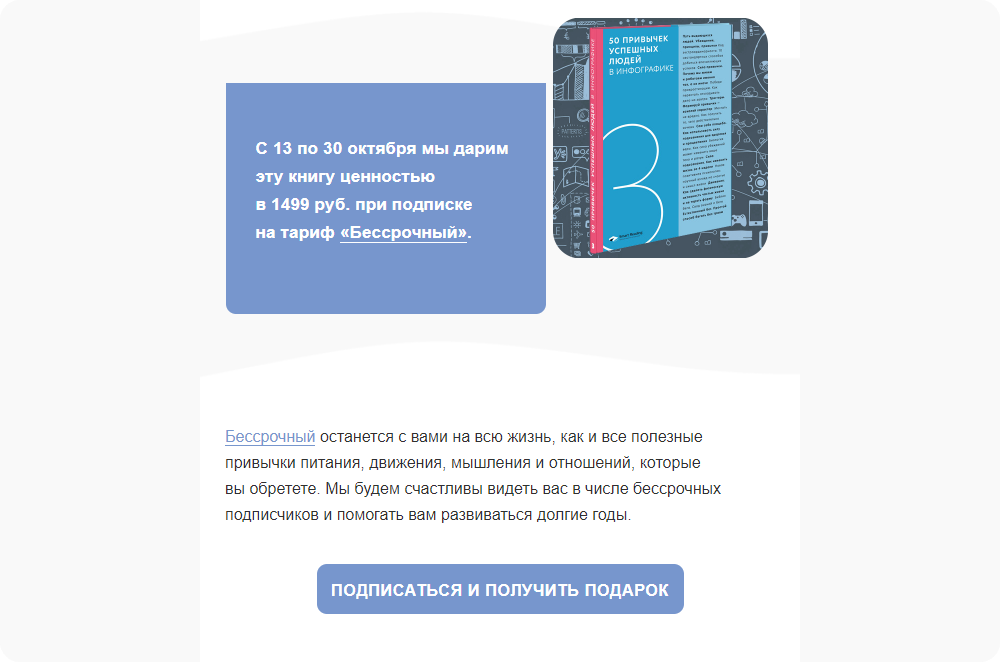 Поэтому рассылку можно использовать как возможность пообщаться с клиентом: предложить бонус в благодарность за покупку, мотивировать заказать что-то ещё, рассказать про сопутствующие продукты.