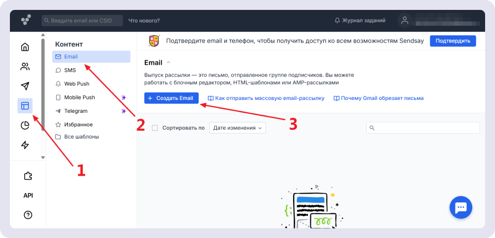 После регистрации перейдите в меню и выберите вкладку «Контент» (1), затем — Email (2), а потом нажмите кнопку «Создать Email» (3).