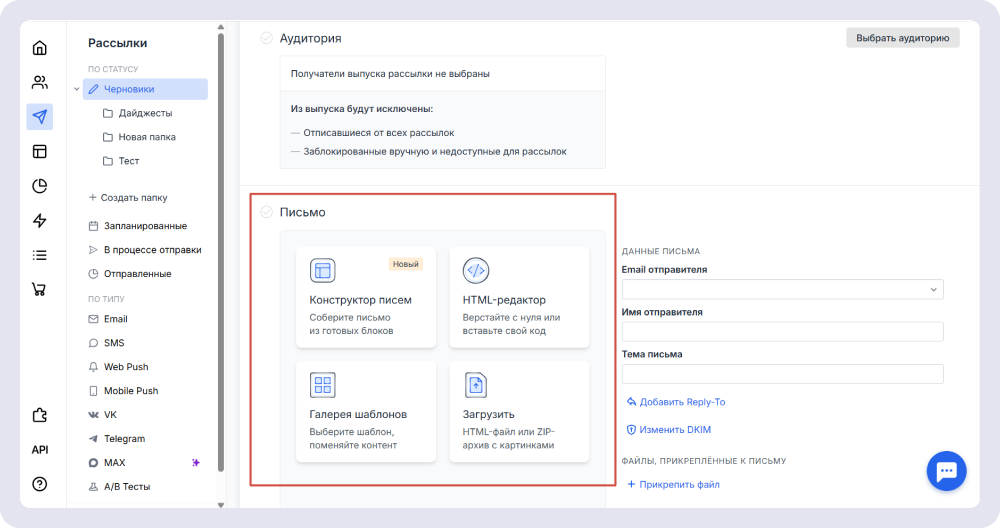Далее нужно создать письмо. Есть три варианта, как это можно сделать: использовать готовые шаблоны писем, собрать свой вариант в блочном или HTML-конструкторе.