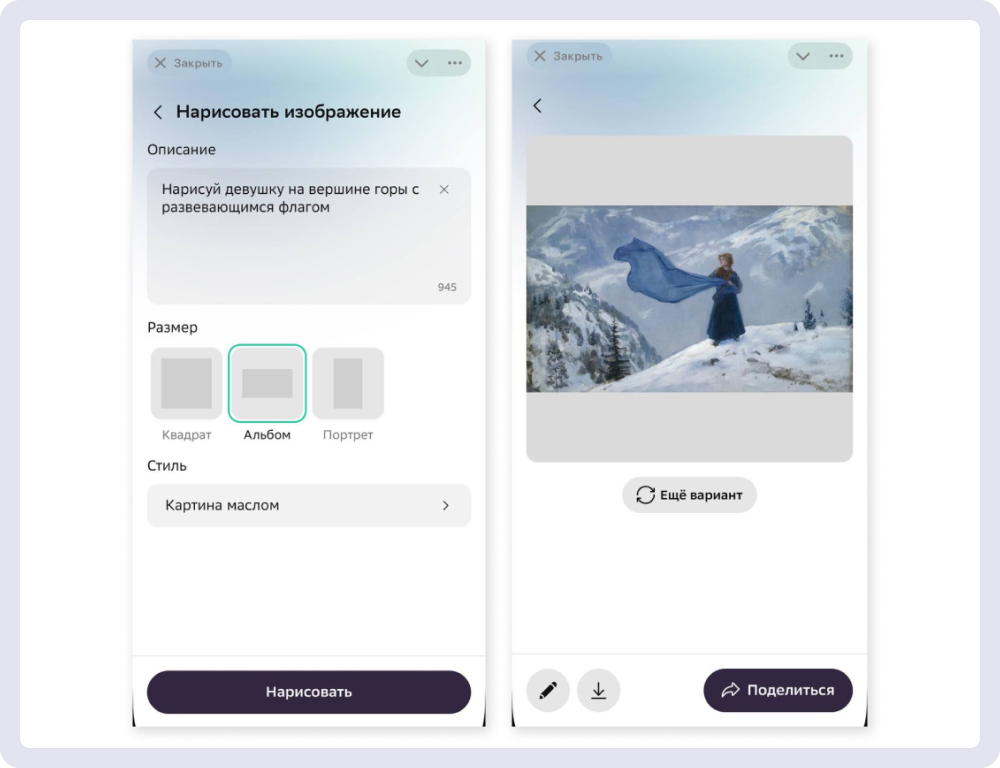 Как пользоваться. Написать промпт, по желанию выбрать стиль.