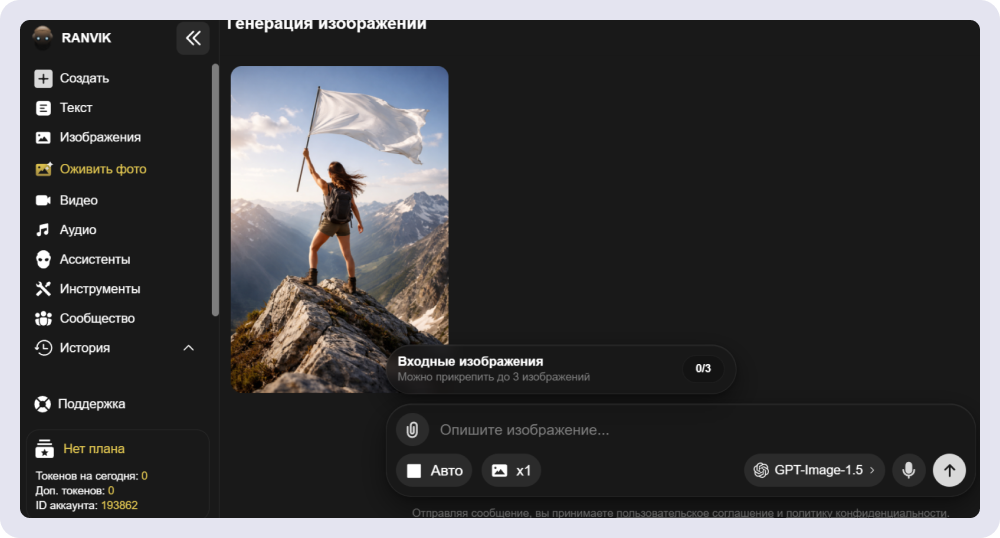 Для работы с картинками нужна регистрация. В бесплатной версии есть ограничения по выбору моделей и количеству генераций. Платная подписка от 299 рублей в день открывает доступ ко всем моделям. Выделяется суточный лимит 500 тыс. токенов на генерацию изображений, текстов, видео и звука. Количество генераций зависит от выбранной модели.