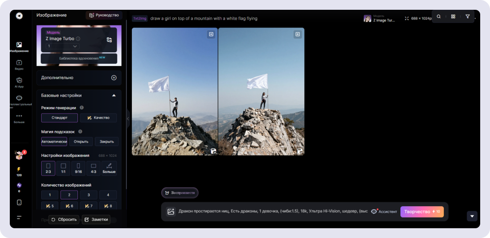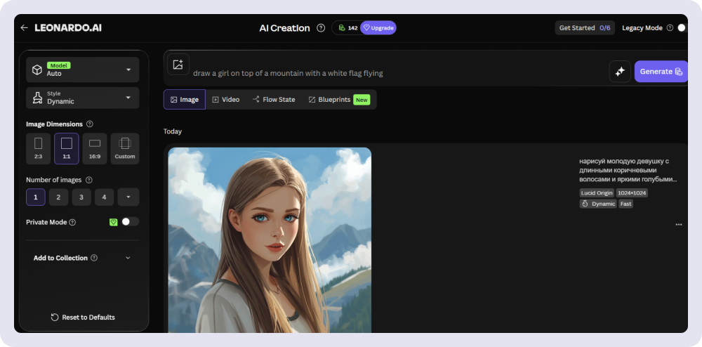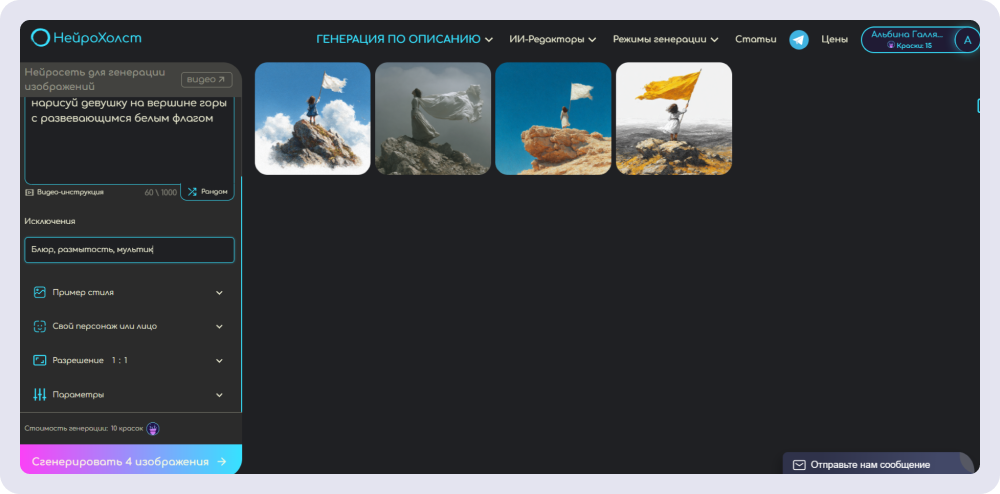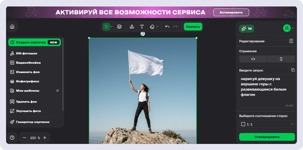 Чтобы была нагляднее разница между нейросетями, мы сгенерировали в каждой картинку по запросу: нарисуй девушку на вершине горы с развевающимся белым флагом. В конце собрали таблицу с выводами, которая поможет выбрать лучшую бесплатную нейросеть для генерации изображений.