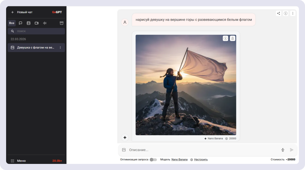 Описание GoGPT. Это агрегатор нейросетей: ChatGPT, Nano Banana, Veo, Midjourney и прочие AI. Позволяет работать с ними в России без проблем. Для генерации изображений используется нейросеть DALL-E 3, которая понимает сложные запросы. Поддерживает как русский, так и английский язык.