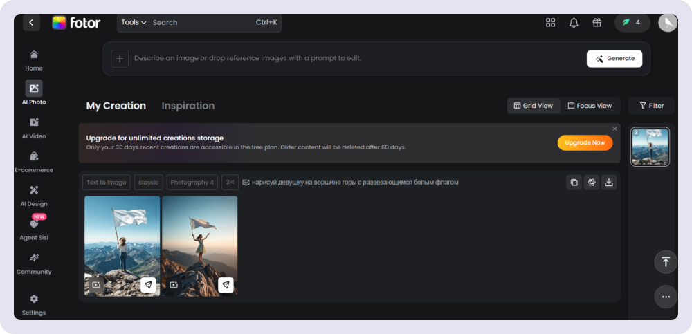Описание Fotor. Не только нейросеть для генерации изображений по описанию, но и полноценный фоторедактор с бесплатными AI-инструментами. Можно создать картинку и довести её до нужного результата. Подойдёт для задач, где важна постобработка: соцсети, баннеры, карточки товаров.