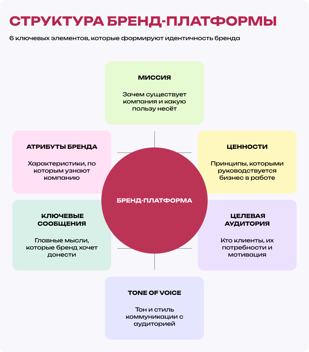 Платформа бренда состоит из нескольких ключевых блоков. Каждый элемент выполняет свою задачу, и вместе они создают целостный образ компании.