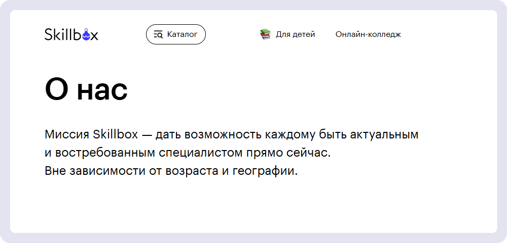 Пример: миссия онлайн-школы Skillbox — дать возможность каждому быть актуальным и востребованным специалистом прямо сейчас. Это определяет всё: широкий выбор курсов, рассрочки на обучение, бесплатные вводные материалы и так далее.