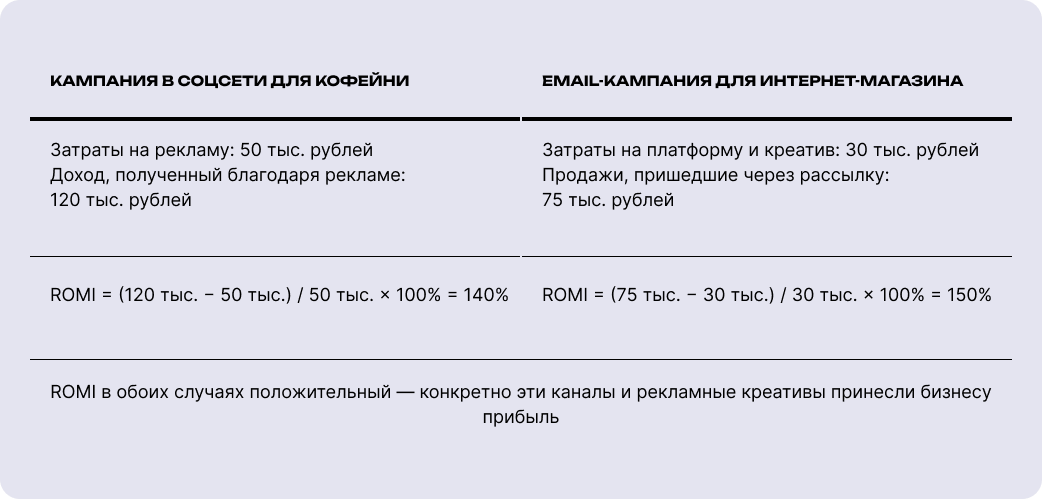 - 50 тыс. на email-рассылку, получив 120 тыс. рублей дохода. ROMI = 140%.