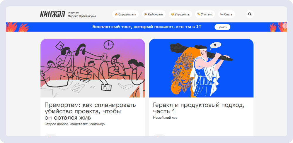 Например, Яндекс Практикум — это сервис онлайн-образования. У компании есть корпоративный блог, в котором пишут про IT-профессии. Но также есть бренд-медиа «Кинжал» с советами автомехаников, обзорами сетевого этикета и размышлениями, почему не нужно читать книги. То есть корпоративный блог рассчитан в основном на клиентов, а бренд-медиа — на всех, кто хочет повышать качество своей жизни.
