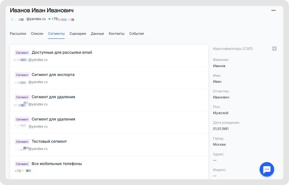 - Мгновенно обновляет сегменты и запускает триггеры. Любое заданное событие автоматически переносит клиента в нужный сегмент или активирует сценарии коммуникации.