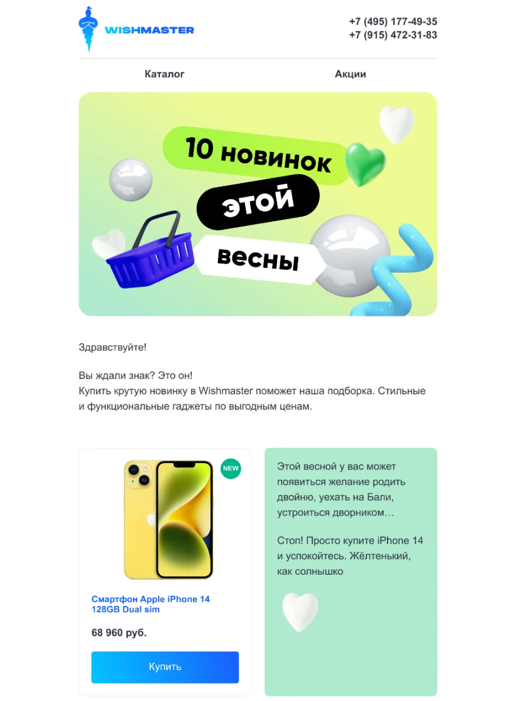 - Email. Бренд может отправлять клиентам информацию об акциях и новинках, делиться обучающим или развлекательным контентом, оповещать о статусе заказов, напоминать о скором окончании действия подписки.