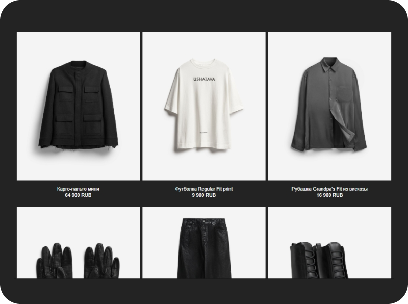 Другой вариант — размещать товары на белом фоне, но добавлять к ним тени. Так делает Ushatava. И даже светлая футболка хорошо видна на белом фоне за счёт тени.