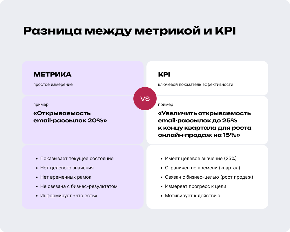 Главное отличие KPI от обычной метрики в том, что у него есть целевое значение, срок достижения и связь с бизнес-результатом. Например, «Открываемость email-рассылок 20%» — это просто метрика. А вот «Увеличить открываемость email-рассылок до 25% к концу квартала для роста онлайн-продаж на 15%» — уже полноценный KPI.