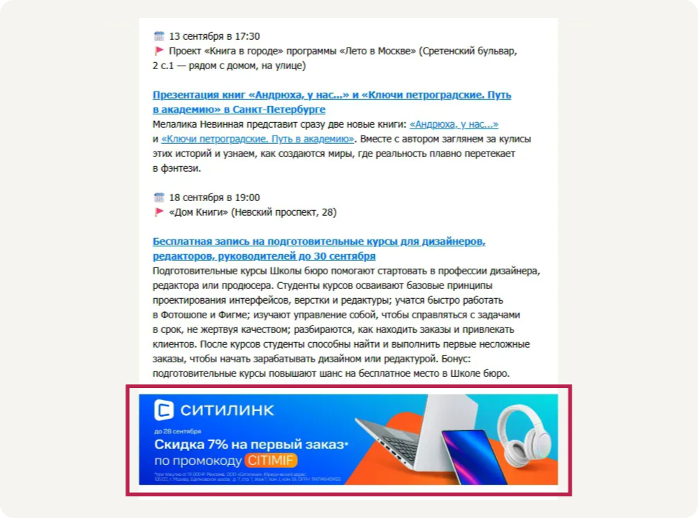 Такие рекламные блоки готовятся быстро и хорошо выделяются в письме. Однако из-за того, что реклама явная, её могут пролистать. А если письмо длинное, то читатель и вовсе может не дочитать до места, где размещён баннер.
