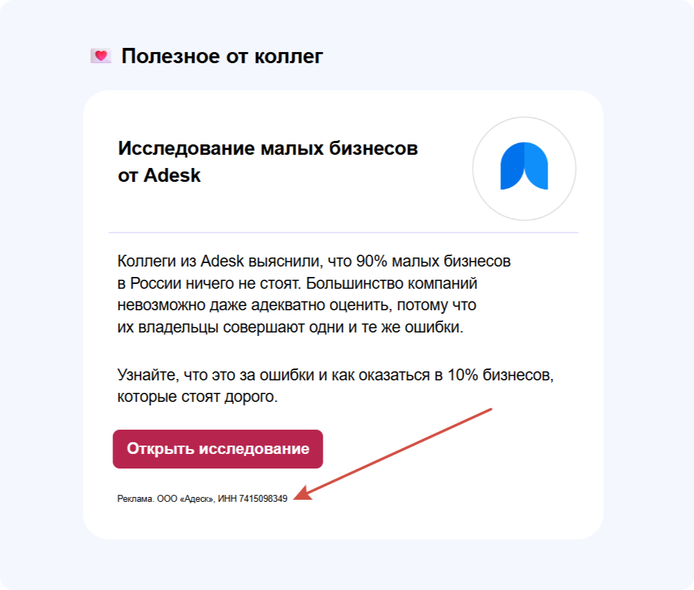 Кроме того, каждое рекламное размещение должно быть помечено. Обычно в рассылках достаточно добавить: «Реклама. ООО/ИП [название], ИНН ХХХХХХ».