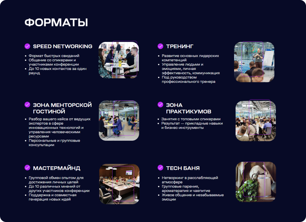 Конференция для представителей бизнеса, стартапов и топ-менеджеров. Основные потоки: будущее науки и технологий, искусственный интеллект, управление в инновационную эпоху, нейросети в маркетинге, инвестиции в инновации. Спикеры — основатели успешных компаний и инвесторы.
