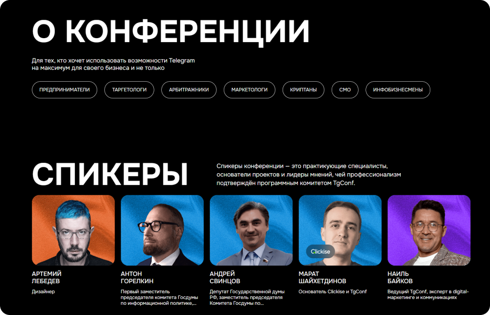 Крупнейшая конференция по трафику и продажам в Telegram. На мероприятие соберутся рекламодатели, таргетологи, блогеры, маркетологи и представители крупных компаний — все, кто привлекает клиентов в мессенджере. Участников ждут образовательная часть с более чем 30 выступлениями, выставка, нетворкинг и масштабная вечеринка.