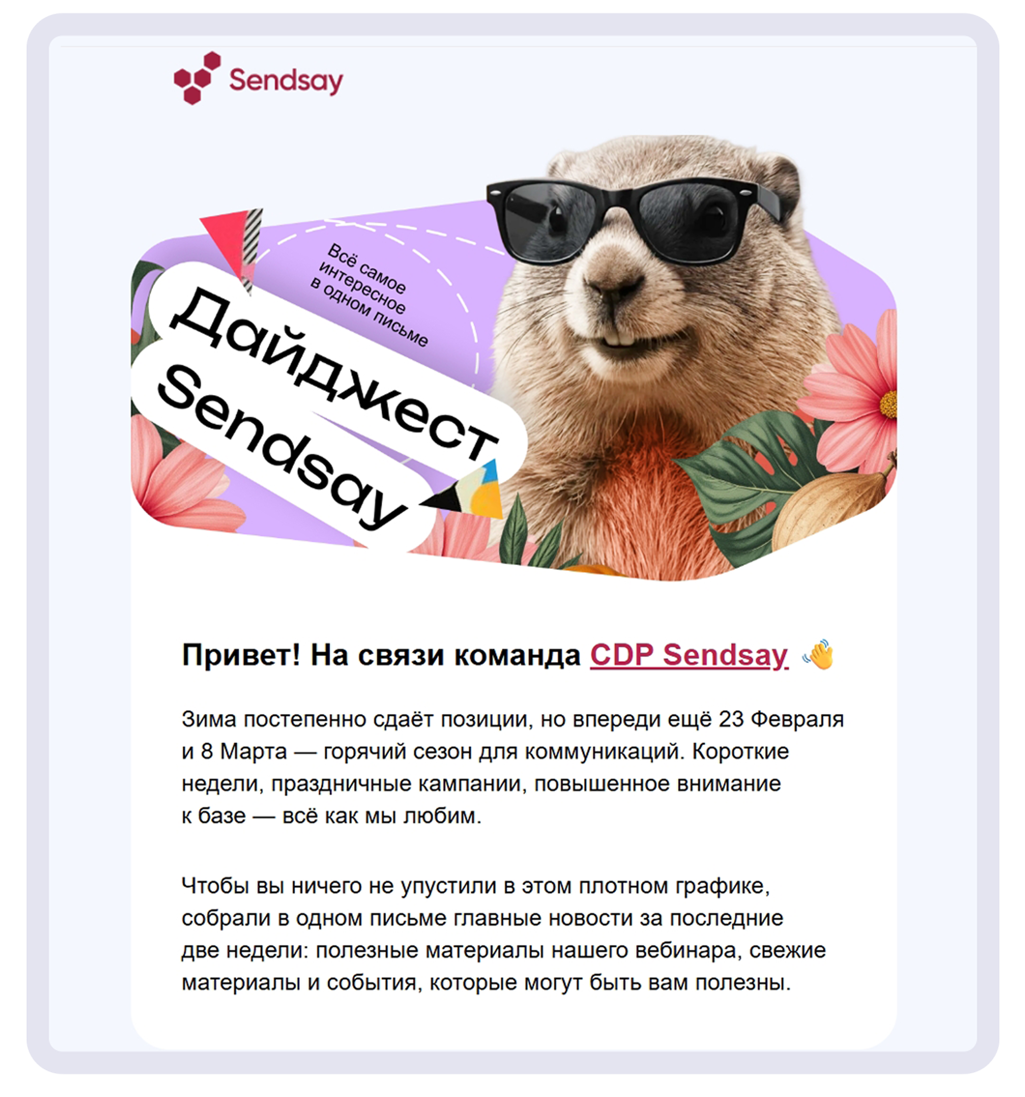 Например, CDP Sendsay в своих коммуникациях делает упор на профессионализм, обращается к аудитории уважительно, но без излишнего формализма. Тональность коммуникации может немного отличаться: например, в соцсетях бренд может шутить, в то время как в чате поддержки диалог направлен исключительно на решение проблемы. Но суть коммуникации остаётся единой во всех каналах.