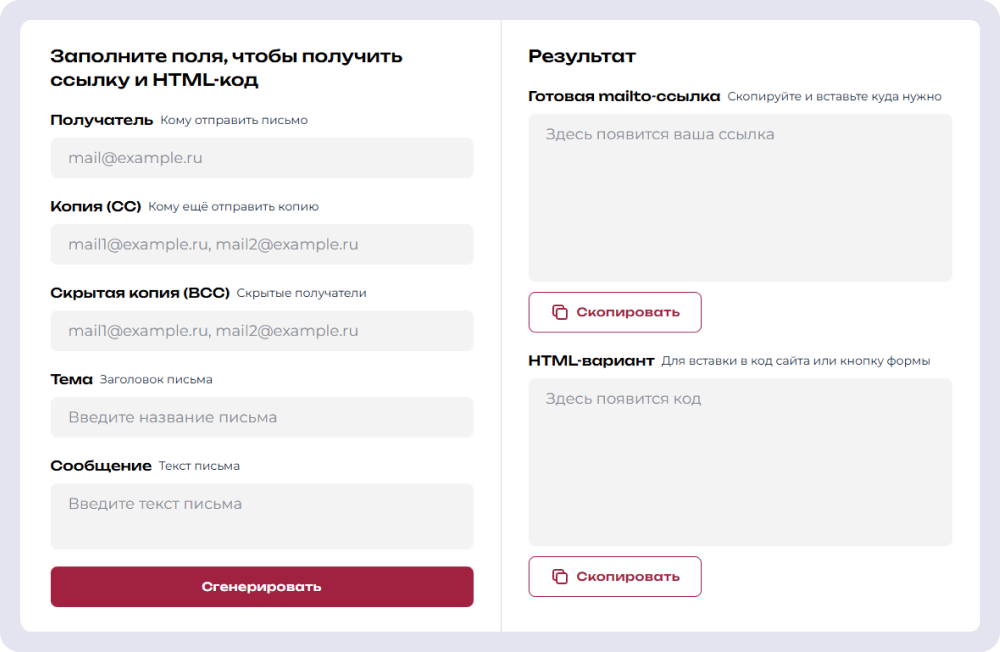 Самый быстрый способ — воспользоваться бесплатным генератором mailto. Инструмент создаёт готовую ссылку и HTML-код, который можно вставить на сайт или в письмо.