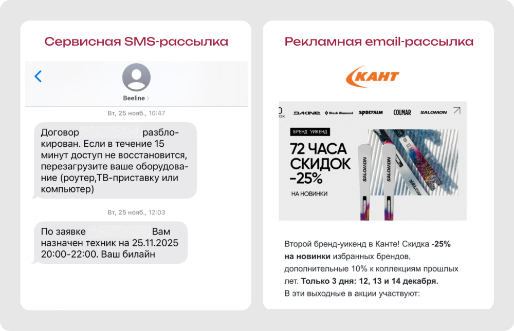 Это может быть связано с разными факторами. Так, в SMS-рассылке компания может отправлять много транзакционных сообщений, которые не нацелены на продажу. Например, код подтверждения или информация о доставке. А продающие сообщения отправляют довольно редко. При этом в почте наоборот — основной фокус на рекламные email-рассылки. Например, анонсы акций и распродаж, подборка просмотренных товаров, персональные промокоды и так далее.