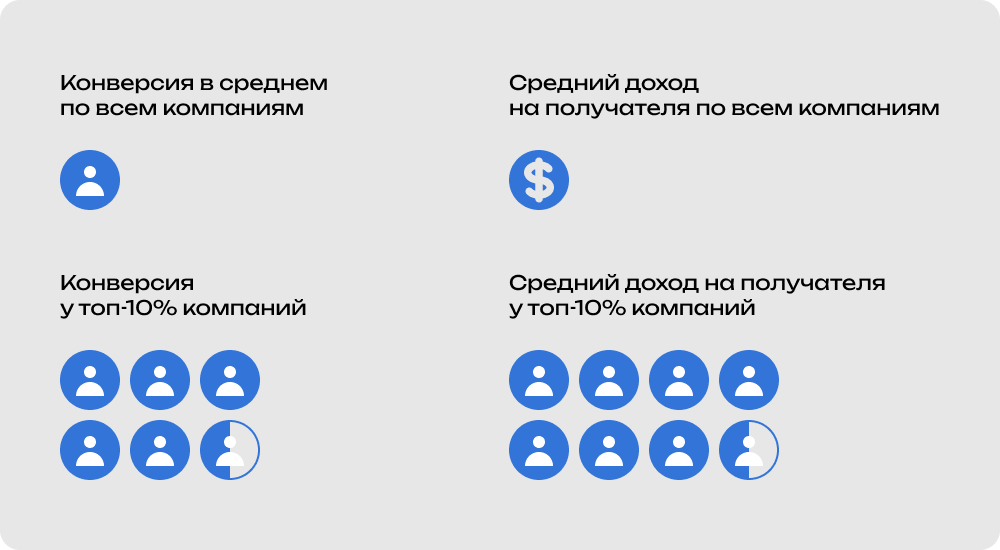 Также примечательно, что между всеми компаниями и лучшими 10% из выборки очень большая разница в показателях. Так, конверсия у лучших компаний в 5–6 раз лучше, а средний доход — в 7–8 раз.