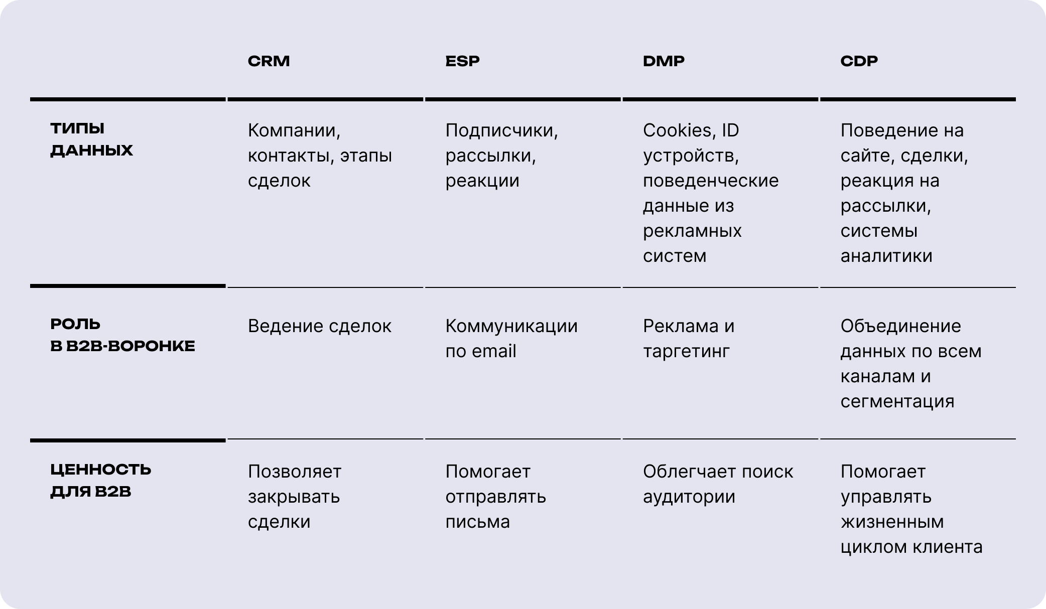 Таким образом, в CRM ведутся сделки, в ESP — email-маркетинг, в DMP — реклама. А CDP объединяет данные из всех этих систем и показывает полную историю взаимодействия с компанией-клиентом. В B2B-продажах это особенно важно из-за специфики модели бизнеса: