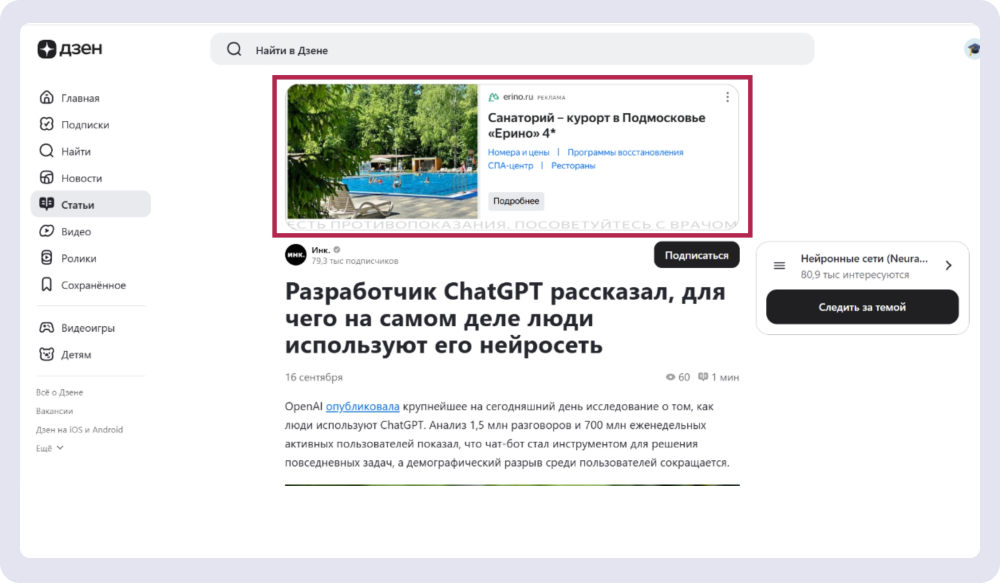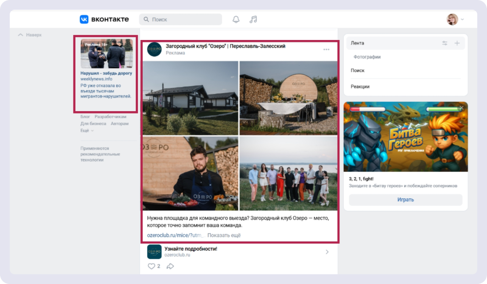 Объявления могут быть в виде текста, баннера, гиф или видео. В социальных сетях они интегрируются в ленту новостей, сторис или мессенджеры, обычно с пометкой «Реклама». Также таргетированную рекламу можно разместить на маркетплейсах, в приложениях и на сайтах с объявлениями. Например, в Ozon, Авито и так далее.