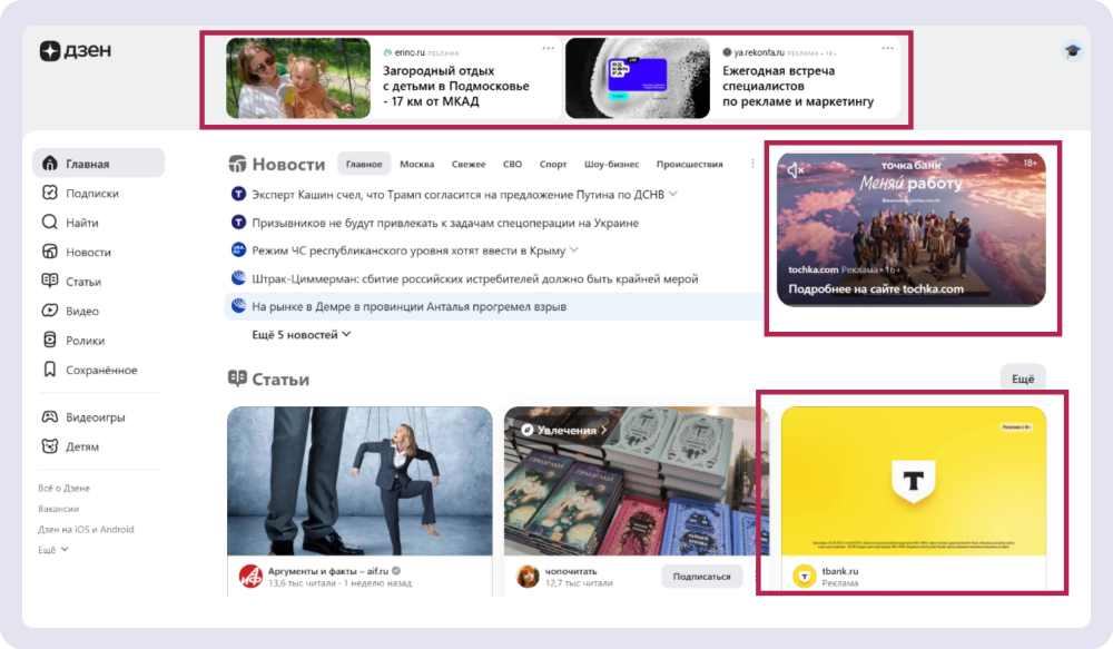 Рекламу размещают на сайтах и в приложениях, зачастую в верхней или боковой части страницы. Это могут быть статичные баннеры, ролики, гиф или интерактивные форматы. Например, мини-сайты или приложения, которые загружаются в рекламном блоке и позволяют взаимодействовать пользователю с контентом — нажимать кнопки, переходить по ссылкам и прочее.