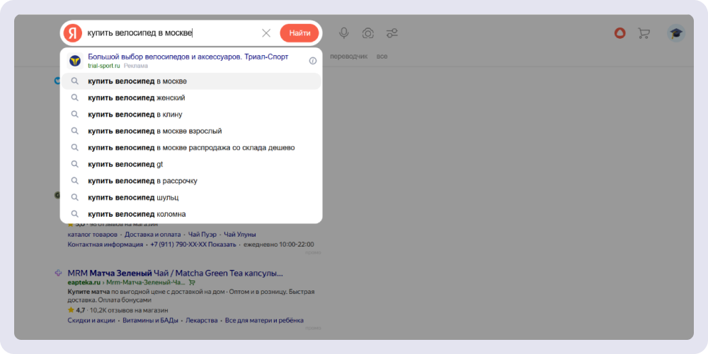 Реклама в поисковых системах появляется в момент, когда пользователь ищет решение, например, «купить жёлтый велосипед». Цель канала — быть на виду в момент выбора и закрывать запрос, когда человек уже готов купить.