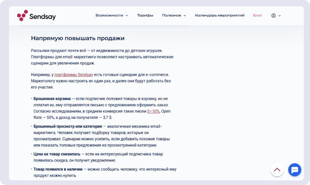 Запустить рассылки для возврата клиента можно с помощью CDP Sendsay. У платформы есть e-commerce решения — готовые сценарии рассылки для брошенной корзины, просмотра или категории, а также оповещения о снижении цены на товар или его появлении в наличии.