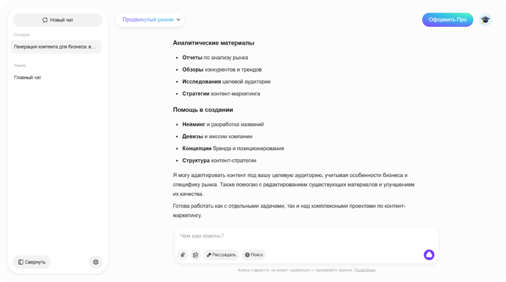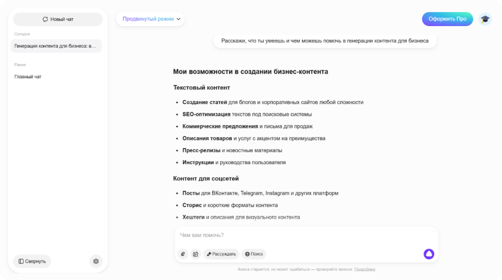 | Генерация контента | Тексты, статьи, посты, рекламные материалы, инструкции | YandexGPT, GigaChat, DeepSeek, ChatGPT |