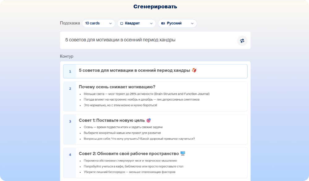 - Как использовать. Выбрать тему, на которую будет статья, настроить параметры SEO и начать генерацию контента.