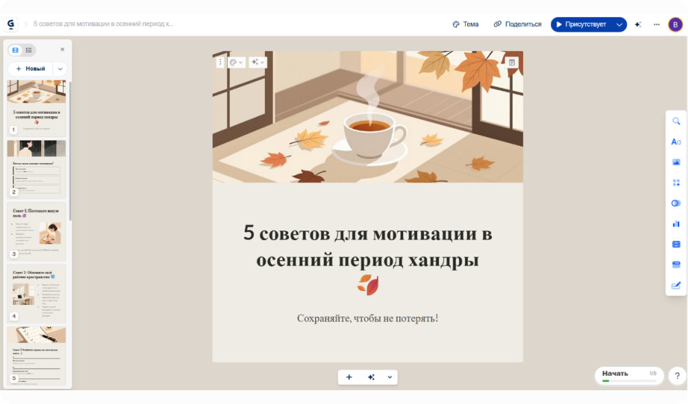Gamma. Помогает создать презентации с использованием нейросети. Быстро генерирует слайды на основе текста и загруженных данных.