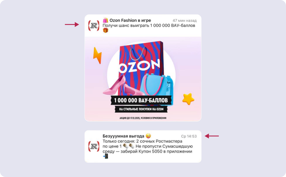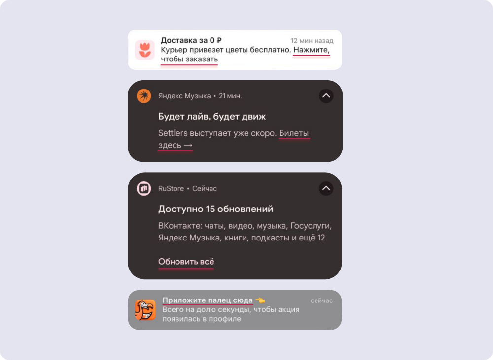 Иконка сразу показывает, от какого бренда пришло сообщение, поэтому человек быстро понимает, кто с ним связался. Это подталкивает пользователя к действию, которое задумала компания: посмотреть акцию, вернуться в корзину или открыть заказ.