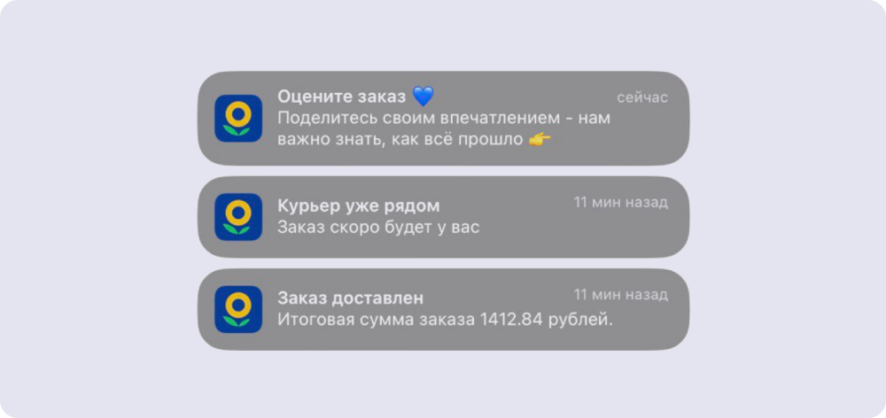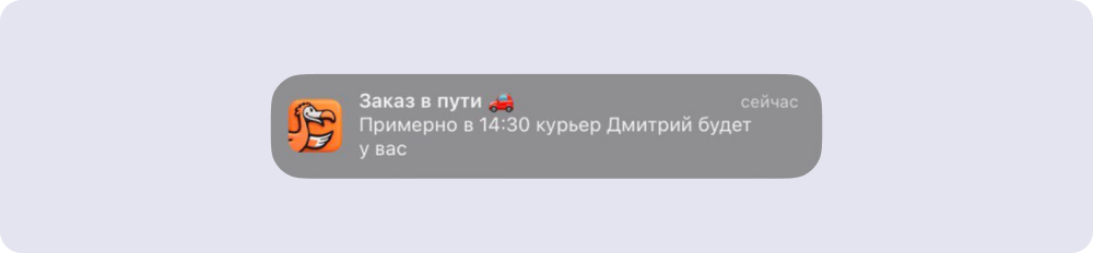 Push замечают так же быстро, как сообщение в мессенджере. Через пуши удобно сообщать о событиях, которые важны клиенту здесь и сейчас: заказ оплачен, курьер уже в пути, заканчивается подписка или срок оплаты.