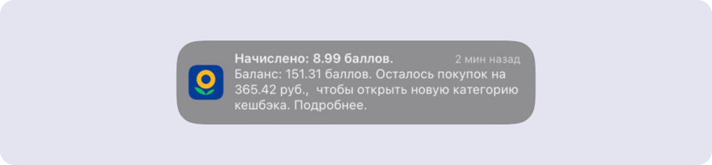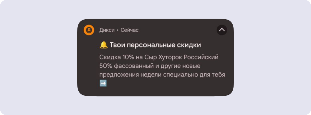 Приложение отправляет подборку выгодных предложений, если клиент часто смотрит акции, но не оформляет заказ. Если чек ниже среднего по категории, приходит уведомление с персональной скидкой на дополнительный товар.