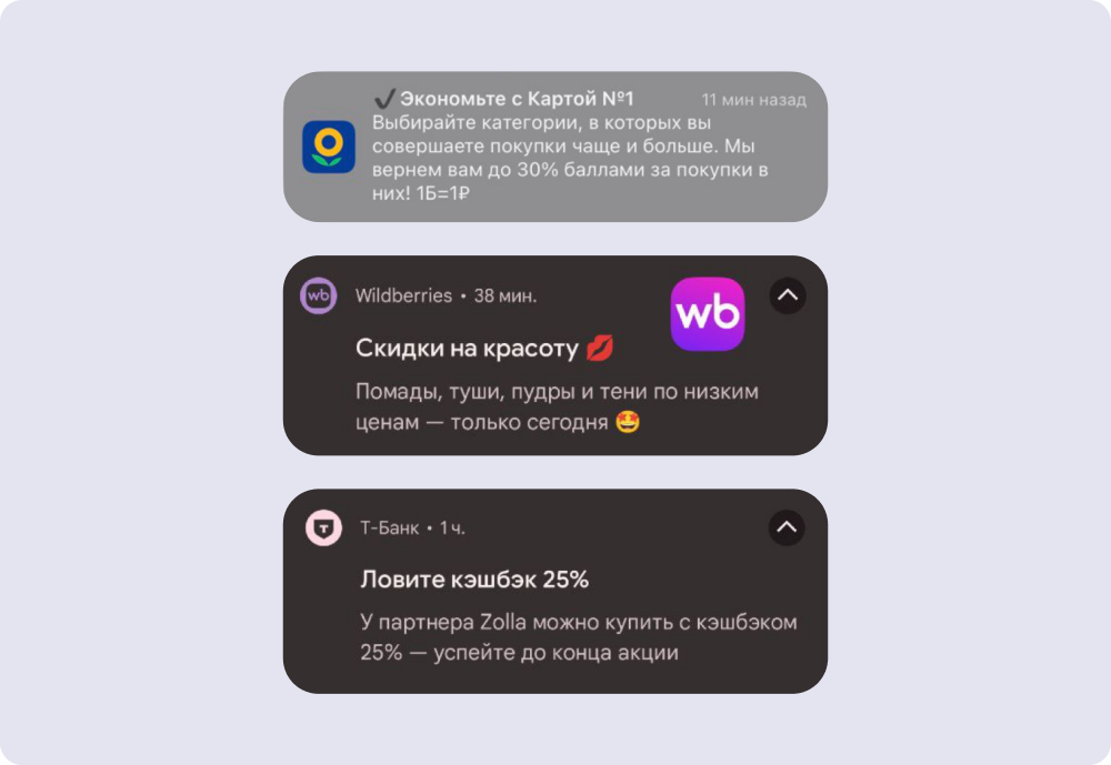 Короткий push с понятным предложением часто эффективнее длинных писем. Он приходит вовремя, сразу привлекает внимание и ведёт к действию в один клик — без лишних шагов и потери интереса.