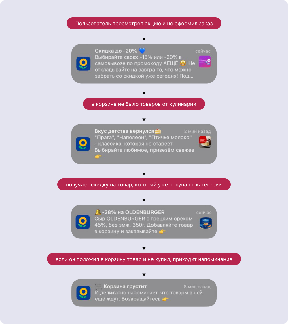 Push хорошо работают в каскадных сценариях. Так, бизнес не засыпает клиента одинаковыми сообщениями, а аккуратно подталкивает его к нужному действию.