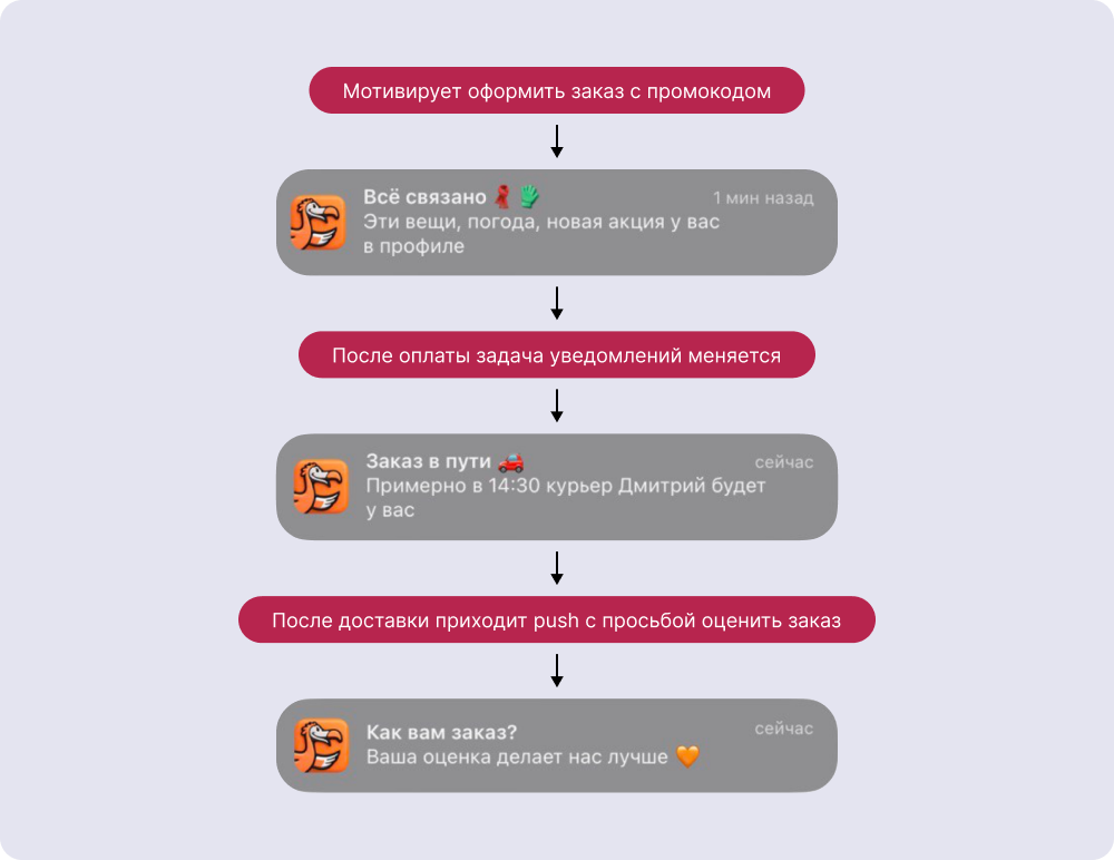 Сначала приходит push с акцией — он мотивирует оформить заказ с промокодом. После оплаты задача уведомлений меняется, и клиент получает сообщения «заказ готовится», «курьер в пути», «доставка будет через 5 минут». Такие уведомления держат человека в курсе событий, снижают тревожность и уменьшают количество обращений в поддержку. Покупатель понимает, что происходит с заказом и когда его ждать. После доставки приходит push с просьбой оценить заказ — так бизнес получает обратную связь и узнаёт, где можно улучшить сервис.