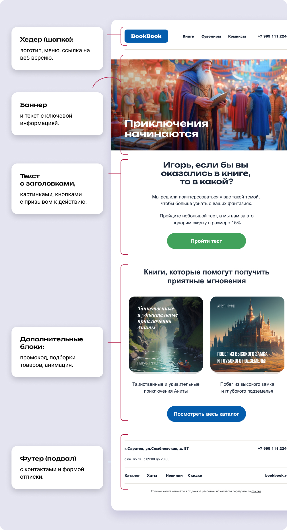 Когда есть цель, куда проще собрать письмо с нуля. Но важно также продумать структуру — как оно будет выглядеть в почтовых ящиках получателей. Чаще всего письма создают по такой структуре: