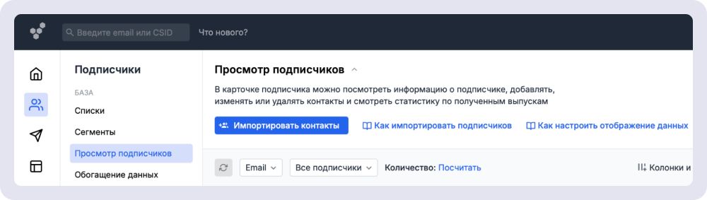 Если у вас уже есть база клиентов — импортируйте её в CDP за пару минут. Перейдите в раздел Подписчики → Просмотр подписчиков → Импортировать контакты. Выберите удобный способ загрузки: вручную, по ссылке или перетащите файл в формате csv, tsv, xlsx, txt или zip. Подробная инструкция по подготовке файла есть в статье.