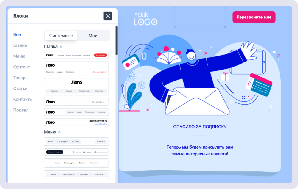 Продуманная структура поможет быстро собрать письмо в блочном конструкторе своими руками — без специалистов. Он работает по принципу drag’n’drop: просто перетаскиваете нужные элементы — текст, кнопку, картинку — и наполняйте их своим контентом. Все элементы уже адаптированы под смартфоны и компьютеры, поэтому письмо будет выглядеть аккуратно на любом устройстве.