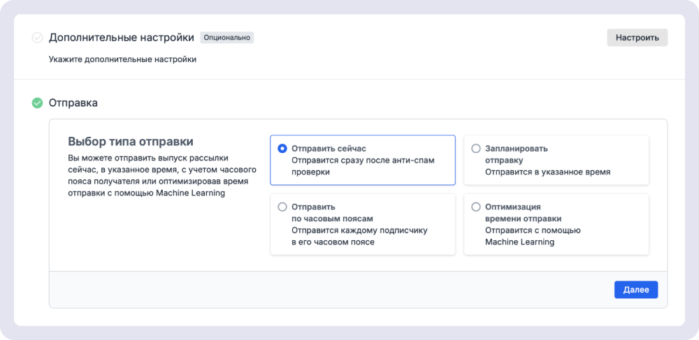 На шаге Отправка укажите, когда отправить рассылку — сразу или позже. При необходимости вы можете отправить письмо по часовым поясам получателей, чтобы в разных частях страны клиенты получили рассылку вовремя. Осталось нажать «Запланировать выпуск» или «Отправить сейчас». Готово!