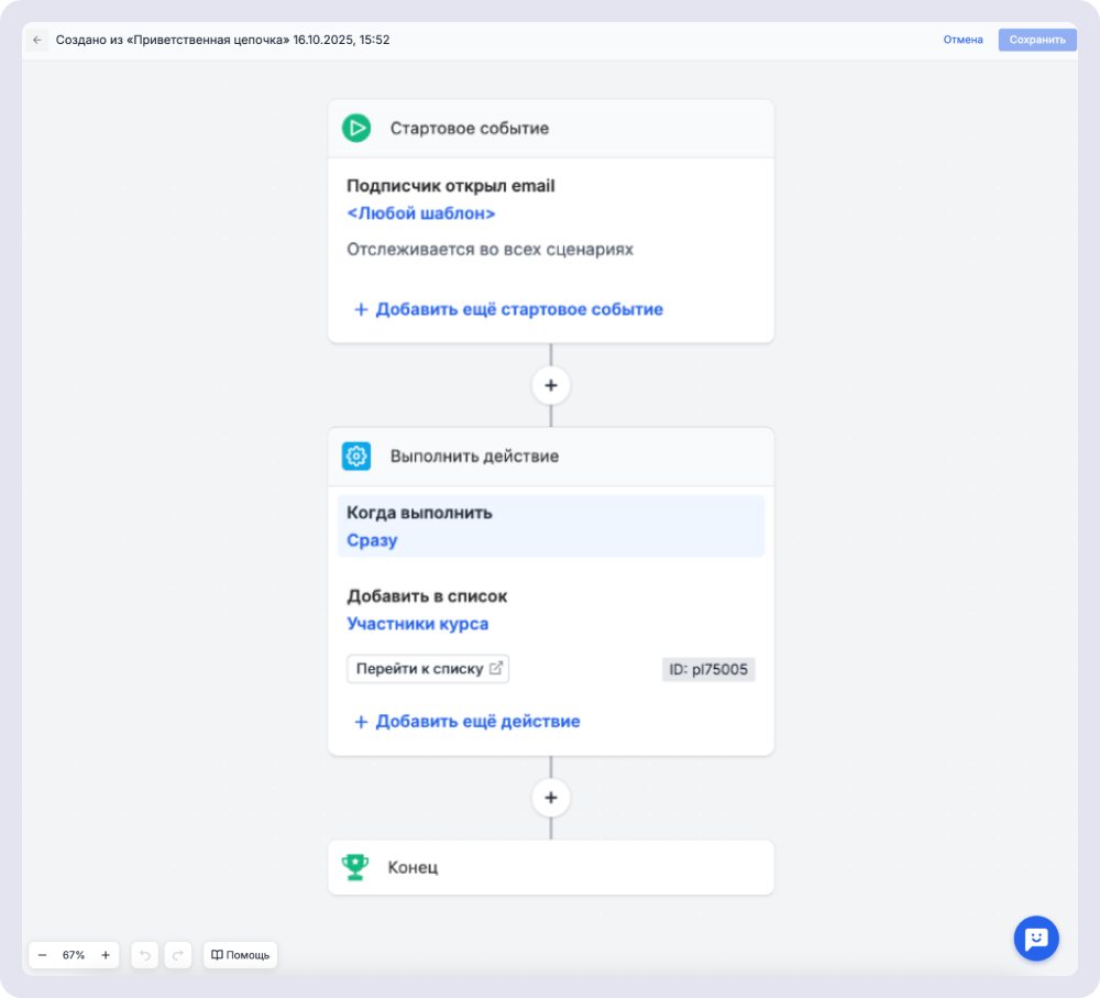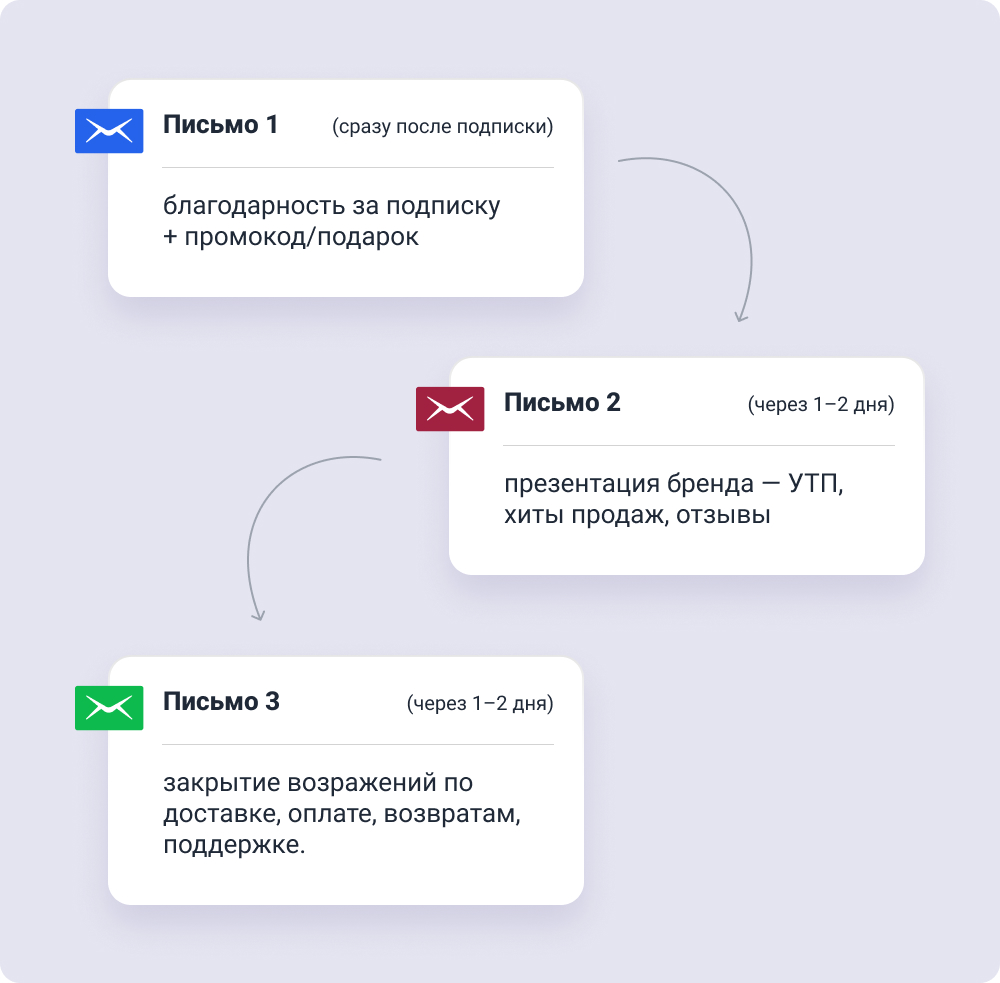Такие письма клиент обычно получает после регистрации на сайте или после подписки через форму. Вот пример сценария:
