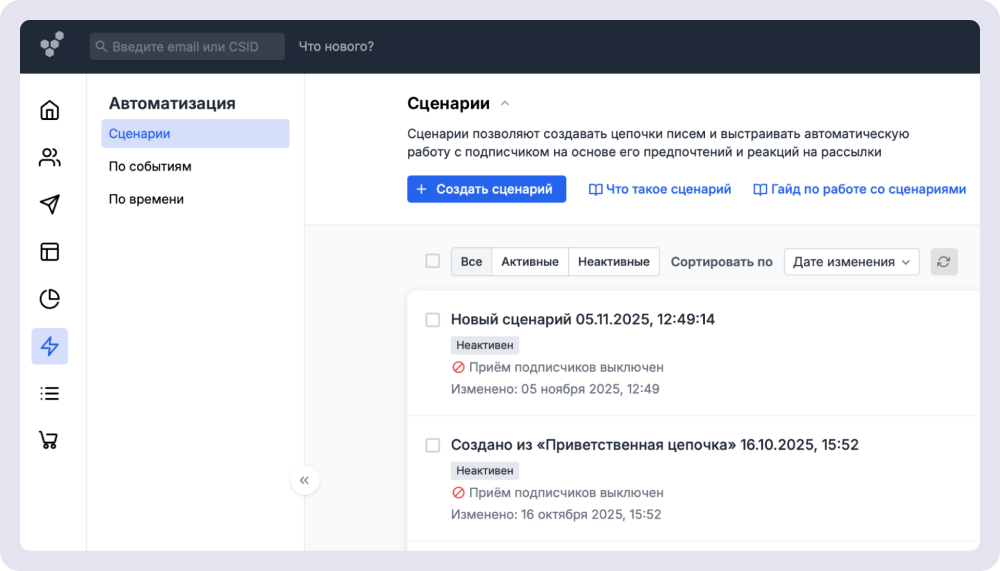 Сценарий — это цепочка автоматических действий, которая запускается при заданных условиях, например, при подписке на рассылку. В CDP Sendsay это наглядная схема того, как система будет реагировать на какое-либо событие или действие подписчика: