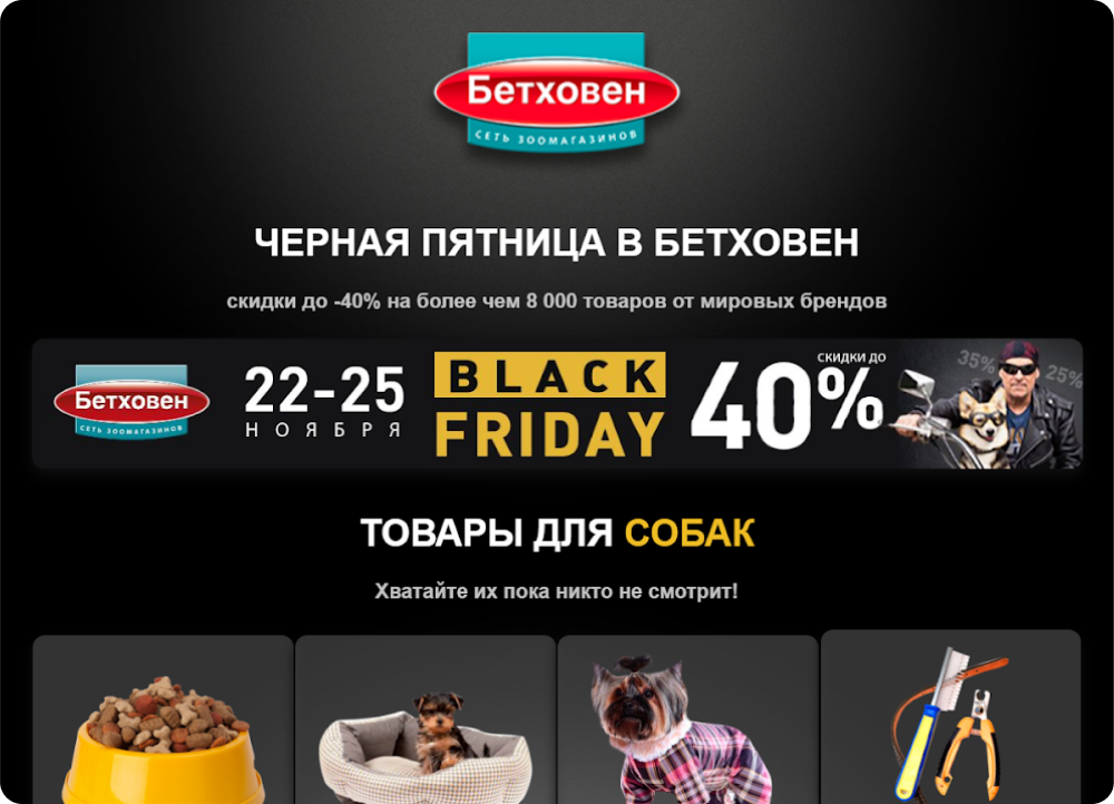 Во многих рассылках в качестве акцентного используется чёрный цвет. В доказательство подобрали два показательных примера. Заметьте, насколько они визуально похожи. Невнимательному глазу даже может показаться, что это рассылка одной компании. Хотя в одном случае это сервис доставки еды, а во втором — магазин товаров для животных. Нужно ли говорить о том, что ни один из вариантов не цепляет ни визуальным рядом, ни текстом.