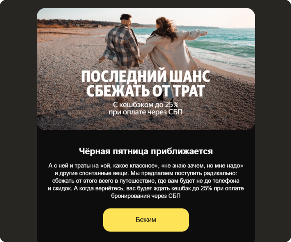 Смотрите на задачу масштабно: что уникального вы можете предложить своему клиенту? Возможно, вы раскроете благодаря Чёрной пятнице смысл своего продукта. Так сделал сервис Яндекс Путешествия — предлагая не тратиться на ненужные вещи, а сбежать от давления маркетологов.