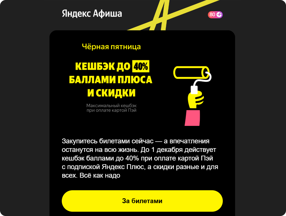 Похожим образом действует другой сервис Яндекса — уже «Афиша». В письме читателю предлагают купить билет на событие, которые принесёт впечатления на всю жизнь.