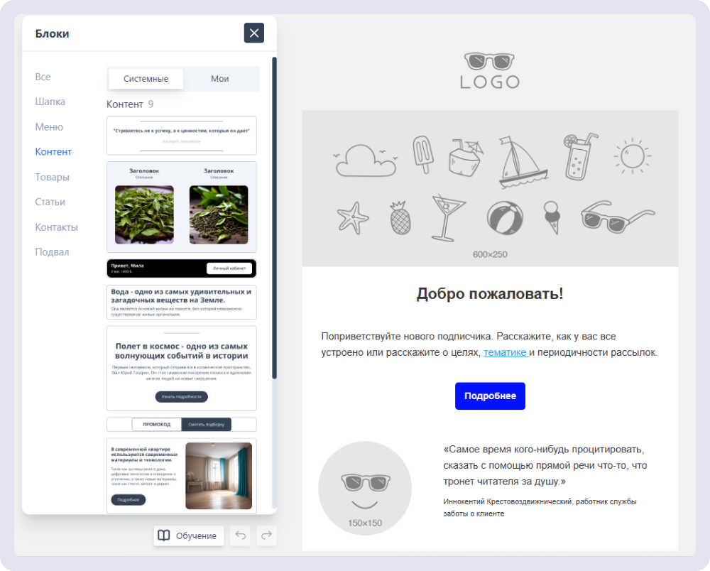 Выберите «Конструктор писем» и приступайте к вёрстке адаптивного письма. Можно собрать каждый блок из отдельных элементов: текст, изображение, кнопка, разделитель и другие. Или воспользоваться готовыми блоками с продуманной структурой: шапка, подборка товаров, статьи, подвал и так далее. Вы можете выбрать один из готовых блоков, или собрать его самостоятельно и сохранить в качестве шаблона для будущих рассылок.