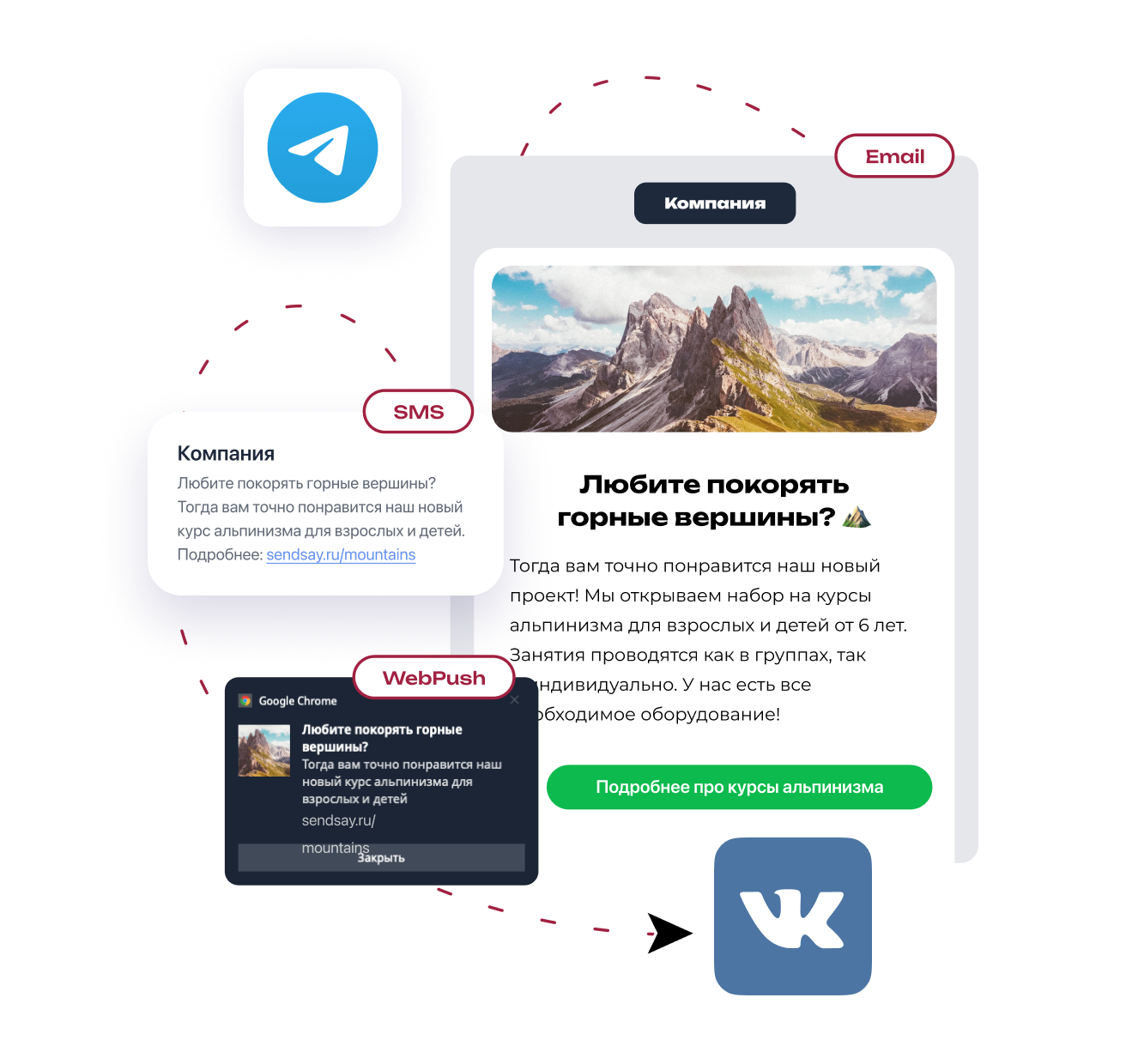 Запускайте кампании в разных каналах для большего эффекта: Email, SMS, Push, Телеграм